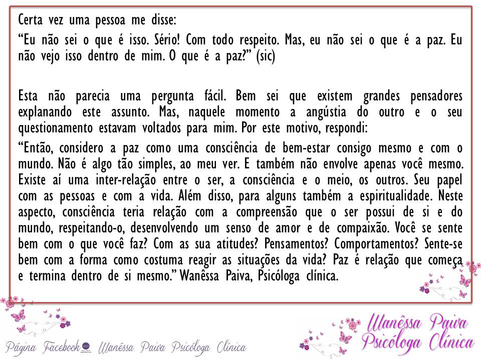 Então, considero a paz como uma consciência de bem-estar consigo mesmo e com o mundo...